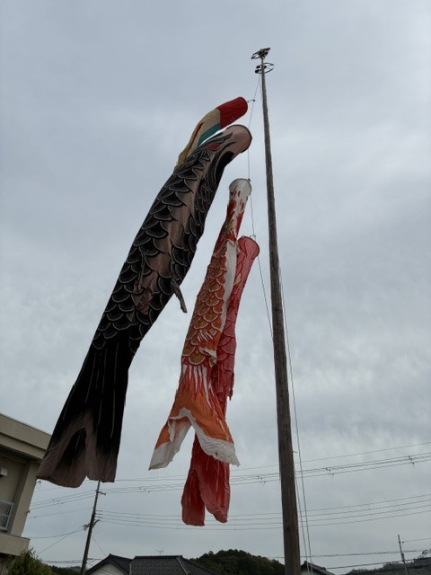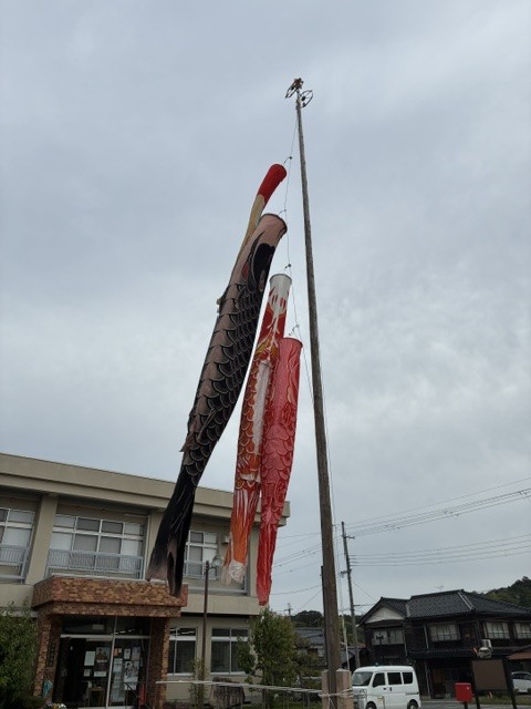 公民館の前の校庭に、今年も鯉のぼりが上がっています。お近くにお越しの折には、見てみてください。